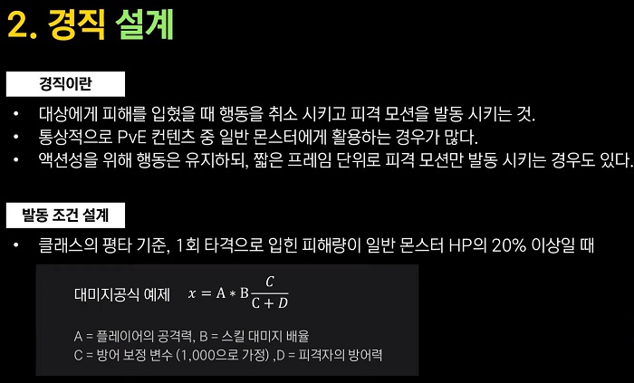 발동 조건 설계 시 예시는 다음과 같다. 1회 타격으로 입힌 피해량이 일반 몬스터의 HP가 20% 이상이라는 조건을 가졌다고 가정하자. 아래는 피격자의 방어력을 분모로한 방어력 대미지 감소율로 치환하여 계산하는 방식의 공식이다. 최종 대미지 X = A * B * ( C + D / C )라고 했을 때, A는 플레이어의 공격력, B는 스킬의 대미지 배율, C는 방어 보정 변수, D는 피격자의 방어력이라는 형태의 수식이다.