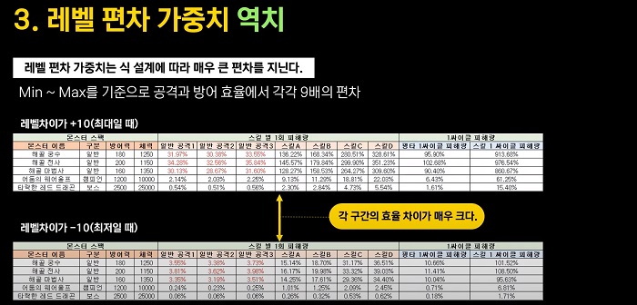 참고로 해당 레벨 편차에 의한 가중치는 최종 대미지에 가중치를 주는 방법 외에도 적중 판정이나 각종 능력치의 연산 과정에 보정 효과로 집어넣어 능력치의 효율 편차를 더욱 증가시키는 방법으로 활용할 수 있다.