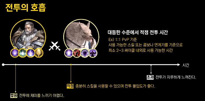 전투의 호흡이란 대등한 수준에서 일어나는 적정 전투 시간을 말하는 것인데, 전투 시간이 너무 짧다면 캐릭터가 보유하고 있는 스킬, 혹은 전투 능력을 모두 발휘하기도 전에 전투가 끝나기 때문에 재미를 느끼기 어렵게 된다. 반대로 전투 시간이 너무 길다면 오히려 전투가 지루하게 느껴져 재미가 떨어지게 된다.