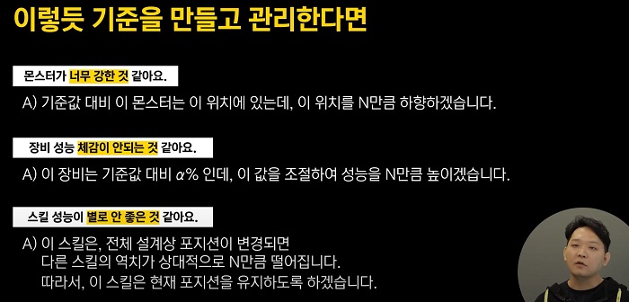다음으로 기준을 명확하게 확립하지 않았다는 점이 이유다. "너무 강하다", "약하다" 등은 사람마다 상대적인 주관의 해석이며 이러한 주관은 디렉션이나 플레이어의 피드백을 통해 얼마든지 밸런스 변경이 가능한 부분이다. 다만, 기준이 정해저야 상향 혹은 하향 등의 판단 및 관리가 가능하다는 점을 설명했다.