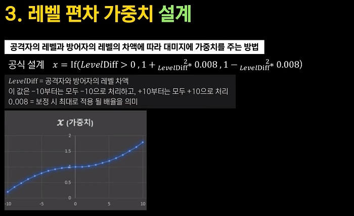 다음은 레벨 편차 가중치 설계다. 공격자의 레벨과 방어자의 레벨의 차액에 따라 대미지에 가중치를 주는 방식으로, 공식 설계는 아래와 같다. 가중치 X는 레벨 디프가 0보다 크다면 1 플러스 레벨 디프 제곱 곱하기 0.008이고, 작다면 1 마이너스 레벨 디프 제곱 곱하기 0.008이다. 여기서 레벨 디프는 공격자와 방어자의 레벨 차액을 의미하며 이 값은 마이너스 10부터는 모두 마이너스 10으로 처리, 플러스 10부터는 모두 플러스 10으로 처리한다. 해당 설정은 공격자와 방어자의 레벨 편차를 최대 10까지만 적용하겠다는 의미다.
