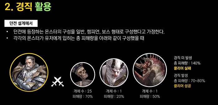 던전에 등장하는 몬스터의 구성을 일반, 챔피언, 보스 형태로 구성했다고 가정하자. 던전을 구성하는 몬스터의 개체수와 피해량은 아래의 그림과 같이 구성했다. 이때 전투를 진행하는 동안 플레이어가 몬스터에게 받는 피해량은 경직이 발생하지 않는다면 대략 140% 내외의 피해를 입게 되므로 플레이어는 사망하게 되고 클리어는 실패한다.