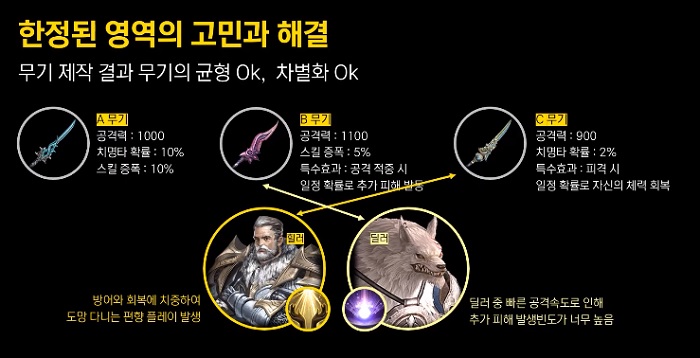 당시 발생했던 문제점을 구체적으로 설명하자면 다음과 같다. 평범한 공격력과 높은 옵션 효율을 가진 A무기, 옵션 효율은 약간 부족하지만 공격력이 소폭 높고 공격 적중 시 일정 확률로 추가 피해의 특수효과를 가진 B무기, 공격력이나 옵션 성능은 낮지만 피격 시 확률적으로 자신의 체력을 회복하는 특수 효과를 가진 C무기를 설계했다. 결과만 놓고 봤을 때 해당 세 가지 무기 타입은 어느 정도 밸런스가 맞았고 각 무기마다 개성도 갖추게 되었다.
