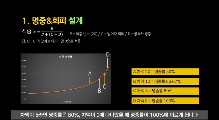 해당 형태의 수식을 사용한다면 차액으로 인해 발생하는 최종 명중률이 유저에게 주는 피드백이 어떻게 다가오게 되는지 많은 플레이 테스트와 피드백을 통해 기준을 잘 잡아야 한다.