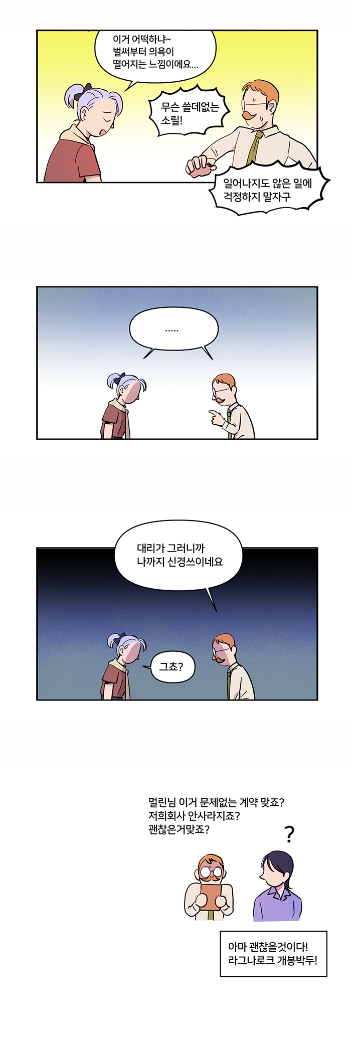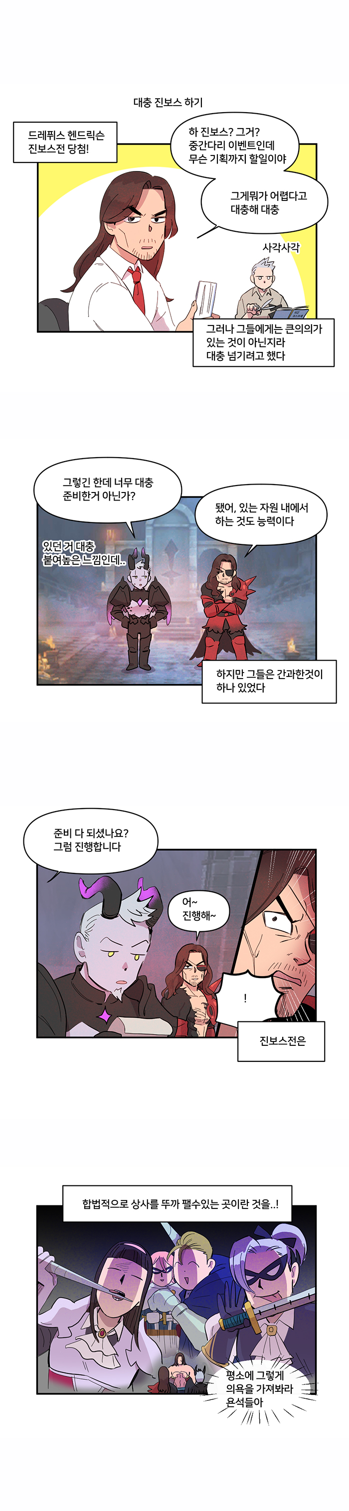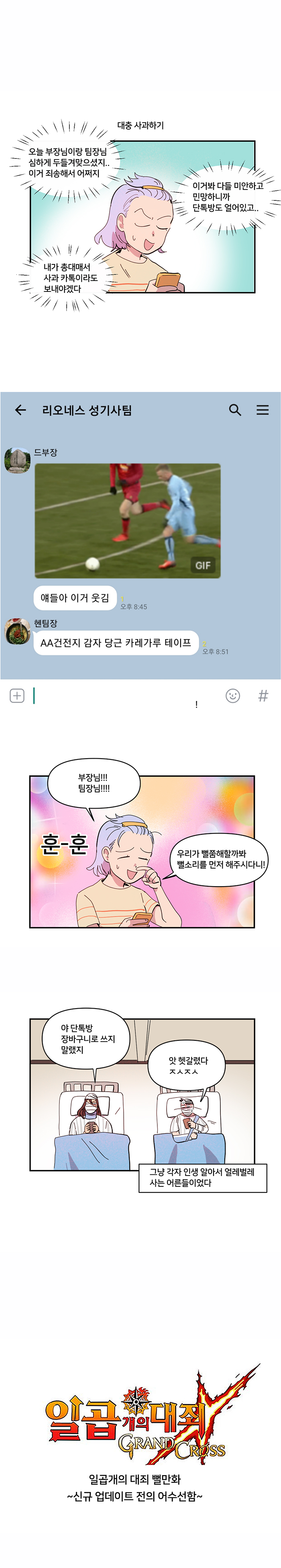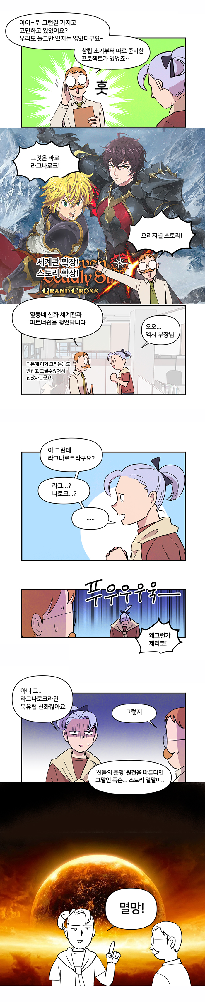 '신규 업데이트 ' 전편은 일곱개의대죄 '라그나로크' 업데이트와 신규 진보스전을 주제로 한 작품. 웹툰 자체 세계관인 리오네스 상사에서 중간 관리자급으로 출연하는 '헨드릭슨과 드레퓌스'에 대한 유머 4컷 만화로 시작해 이번 주 업데이트 예정인 오리지널 스토리 '라그나로크'에 대한 이야기로 마무리된다.