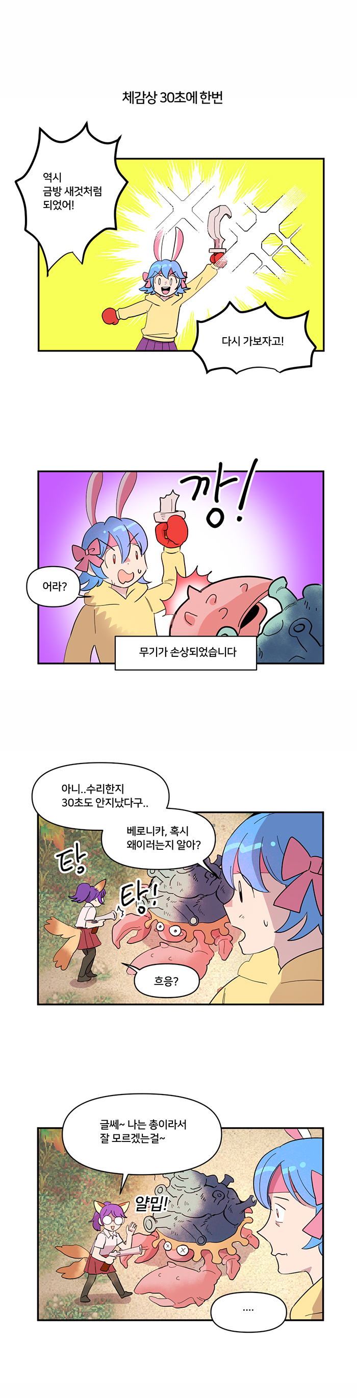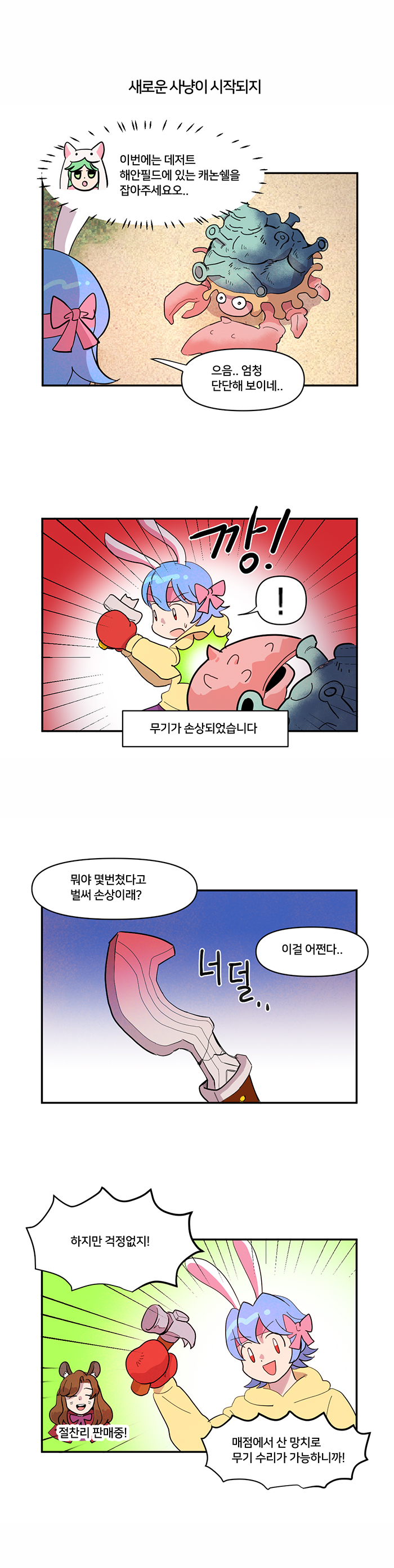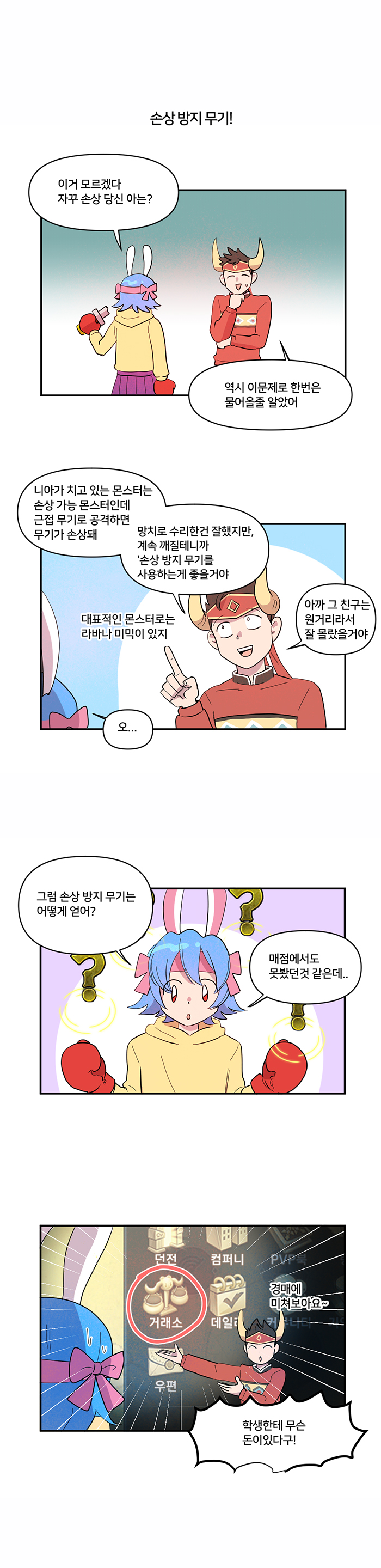 이번 4화에서는 트릭스터M 내 근접 캐릭터가 겪는 애환 중 하나인 '무기 손상'과 관련된 에피소드를 풀어냈다. 트릭스터M에는 무기 손상 몬스터가 따로 존재해 해당 몬스터를 근접 무기로 칠 경우 무기가 손상된다. 수리 망치로 수리를 할 수 있지만, 어디까지나 임시방편이기 때문에 이러한 몬스터를 처치하기 위해서는 손상 방지 무기가 필수다.
