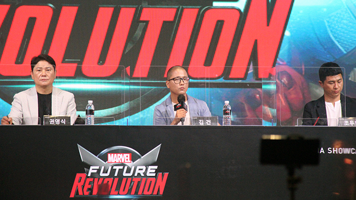 이어서 김건 대표는 "마블 퓨처 레볼루션 개발 과정은 개발진 모두에게 새로운 도전이었다. 전작을 통해 다양한 노하우를 쌓았지만, 광활한 오픈월드를 모바일에 최적화시키는 것은 쉽지 않았다. 하지만 마블과 긴밀한 협업을 통해 최고 수준의 모바일 게임을 만들 수 있었다. 총 여덟 종의 슈퍼 히어로를 제공하며, 다양한 커스터마이징과 전투 콘텐츠를 선보일 예정이다"라며 환영사를 말했다.
