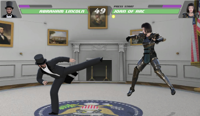 이번엔 위인이 등장하는 격투 게임입니다. 바로 '히스토리 워리어즈'입니다. 게임에 등장하는 캐릭터는 '윌리엄 셰익스피어'와 '클레오파트라', '에이브러햄 링컨', '잔 다르크', '체 게바라', '샤카 줄루', '모짜르트', '나폴레옹' 등 이름을 남긴 위인들입니다. 일부는 위인 같지 않다고 생각하시나요? 괜찮습니다! 메인 빌런은 바로 나치 독일의 수장 '아돌프 히틀러'거든요!