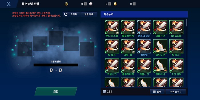 특수능력의 조합 시스템도 추가된다. 플레이어가 보유한 특수능력을 조합해 새로운 특수능력을 획득할 수 있으며 조합을 통해서는 최대 A등급까지 획득 가능하다. 조합 방식은 블럭 조합과 매우 유사한 형태로, 어떤 등급의 특수능력을 투입하느냐에 따라 조합을 통해 획득할 수 있는 특수능력의 등급이 달라진다.