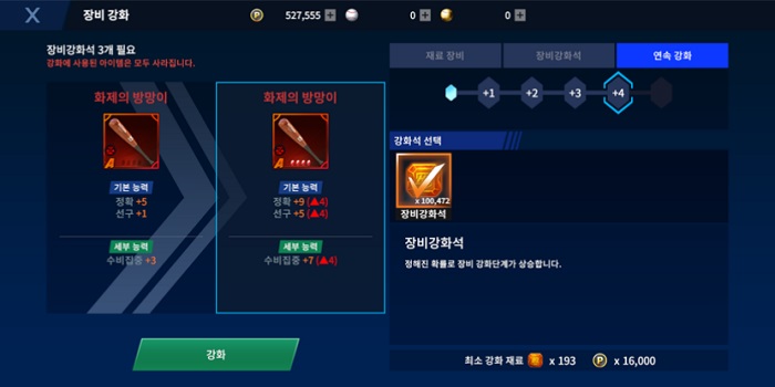 이번 업데이트를 통해 장비 연속 강화 시스템도 선보였다. 이제는 원하는 목표 강화 수치까지 자동으로 장비를 강화할 수 있게 된 것이다. 만약 목표 강화 단계에 도달하거나 강화 재료가 부족할 경우에는 자동으로 연속 강화가 중단되며, 일반 강화와 연속 강화의 성공 확률 및 재료, 비용 등은 모두 동일하다.