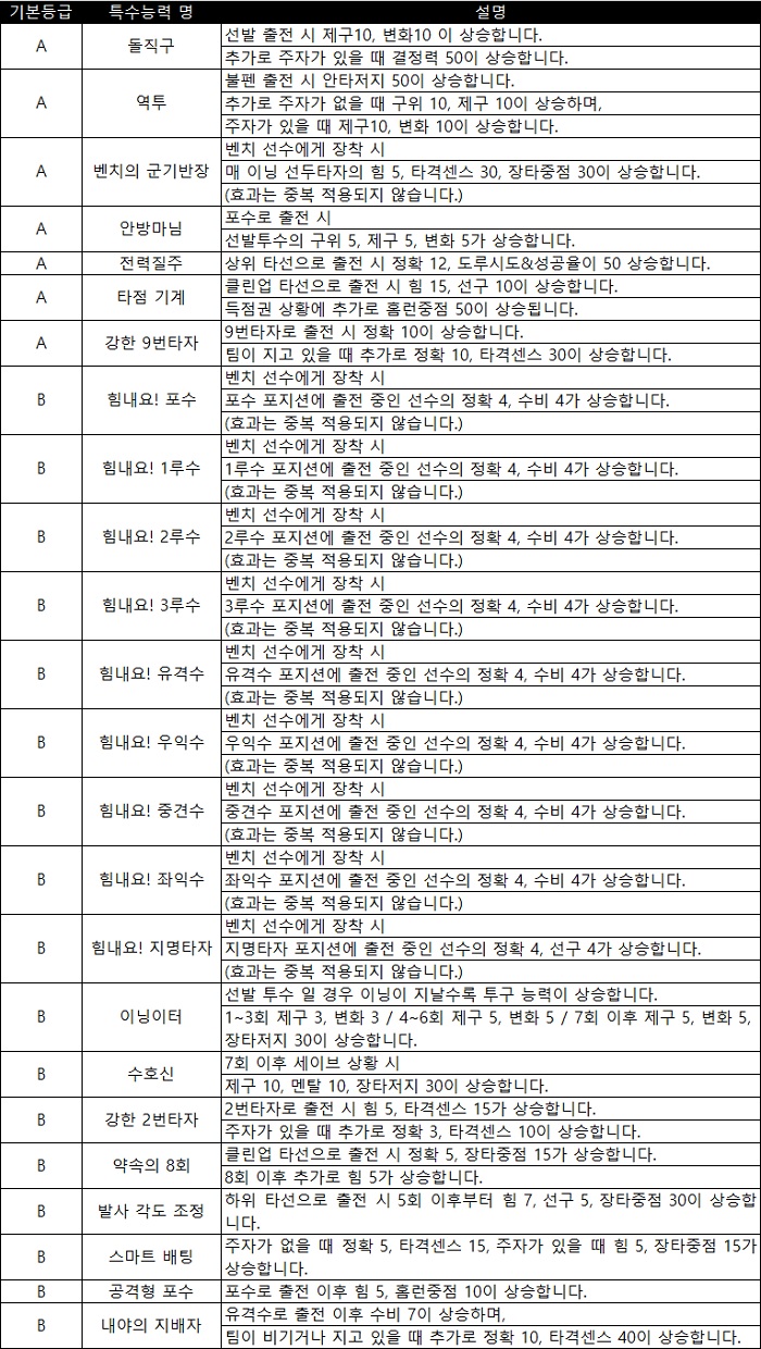 신규 A급 및 B급 특수능력의 종류는 다음과 같다.