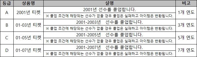 신규 콜업 아이템으로는 A, B, C, D 각 등급 별로 1종 씩 추가됐다. A등급으로는 2001년 선수를 콜업할 수 있는 '2001년 티켓', B등급으로는 2001년부터 2003년 선수를 콜업하는 '01-03년 티켓' 등을 선보였다.이외에도 컬렉션 챌린지를 새롭게 오픈했으며 콘텐츠 미션과 프로모션 미션으로 이뤄진 신규 도전과제가 진행된다.