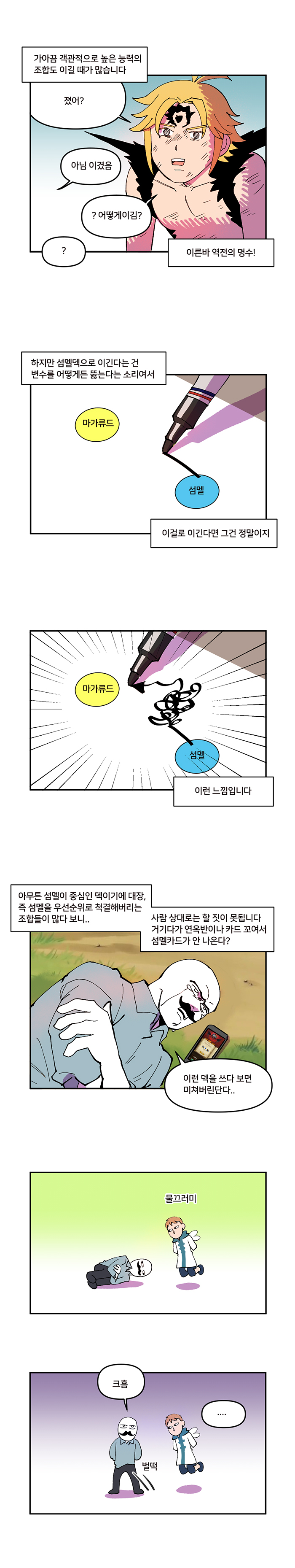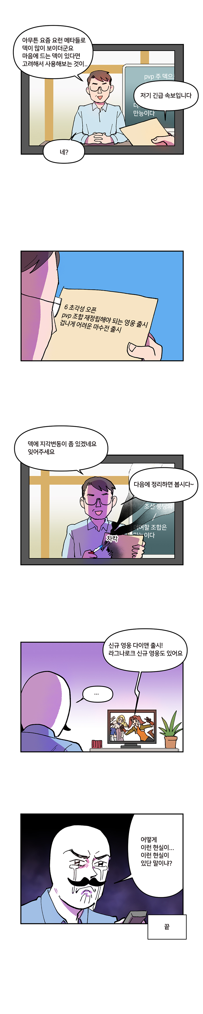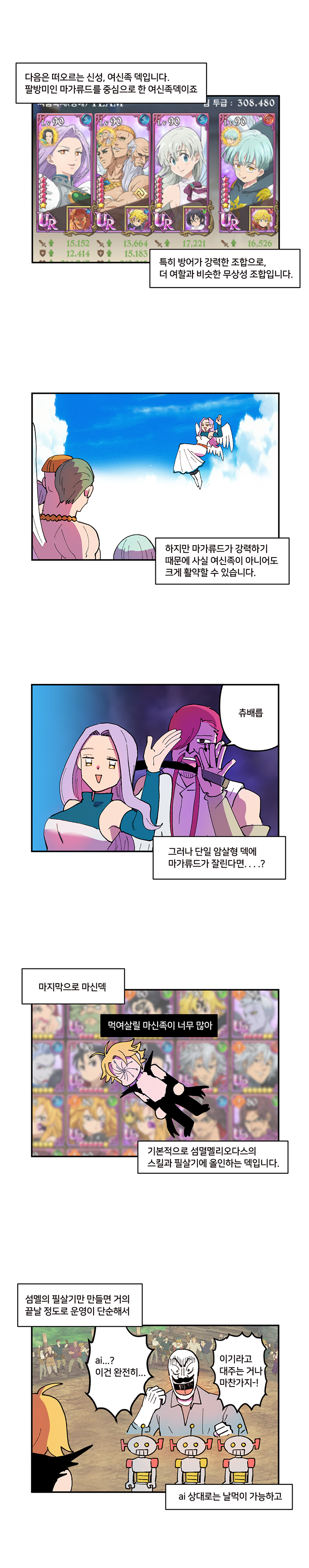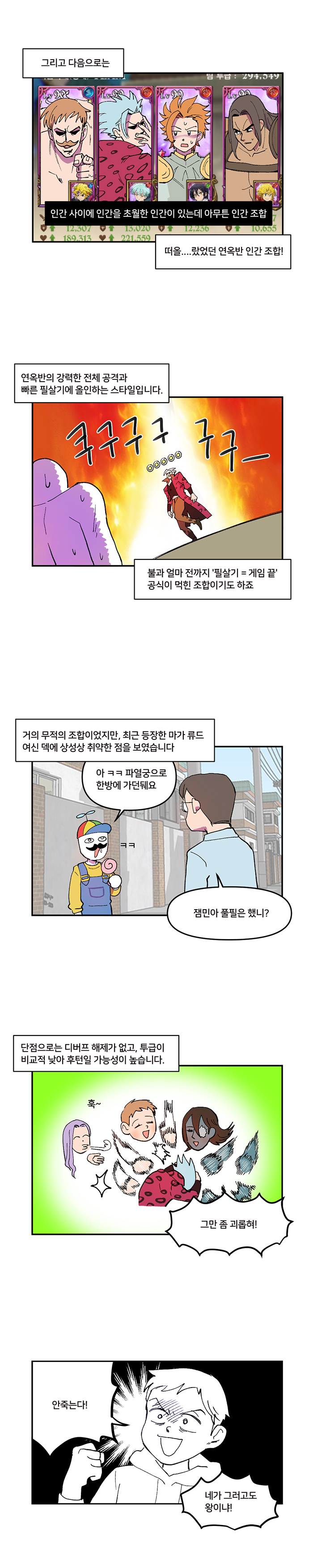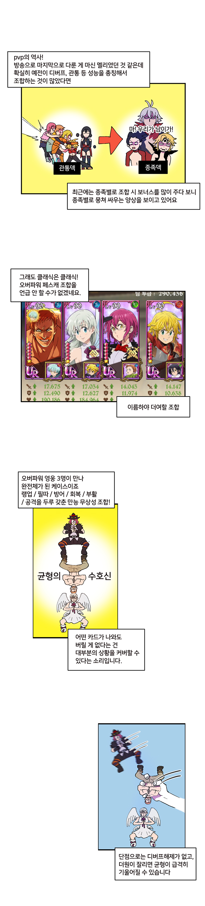일곱개의대죄는 특성상 신규 캐릭터 등장에 따라 유행하는 조합이 계속 바뀌고 있는 중. '오랜만에 보는 PVP의 역사'편은 현재 가장 많이 이용되고 있는 속칭 'PVP 대세 조합'에 대해 알아보는 웹툰이다.