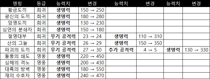 일부 도끼 무기의 옵션도 변경됐다. 변경된 옵션은 생명력과 무기 공격력, 추가 공격력 등이 있으며 이를 상향 조정해 철벽 무공의 유지 조건 변경으로 인한 방어 효율의 감소를 대체했다. 옵션이 변경된 도끼 무기의 종류는 아래와 같다.