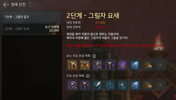 가장 먼저 PvP 던전인 '그림자 성채'의 던전 단계가 2개로 세분화됐으며 던전 규칙이 변경됐다. 1단계 '그림자 입구'는 전투력 16,000 이상부터 입장이 가능하며 2단계 '그림자 요새'는 입장 가능 전투력이 22,000이다.