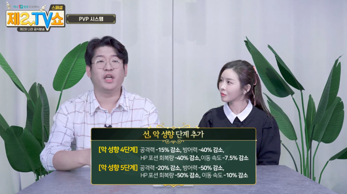 또한 악 성향 유저에 대한 페널티도 강화된다. 선 성향과 악 성향 유저의 단계가 최대 5단계까지 늘어나며, 악선향 유저는 기존 페널티인 방어력 감소뿐만 아니라 공격력과 이동 속도가 추가로 감소하며, 선 성향 유저는 악 성향 유저에게 받는 피해량 감소 옵션을 추가로 받는다.