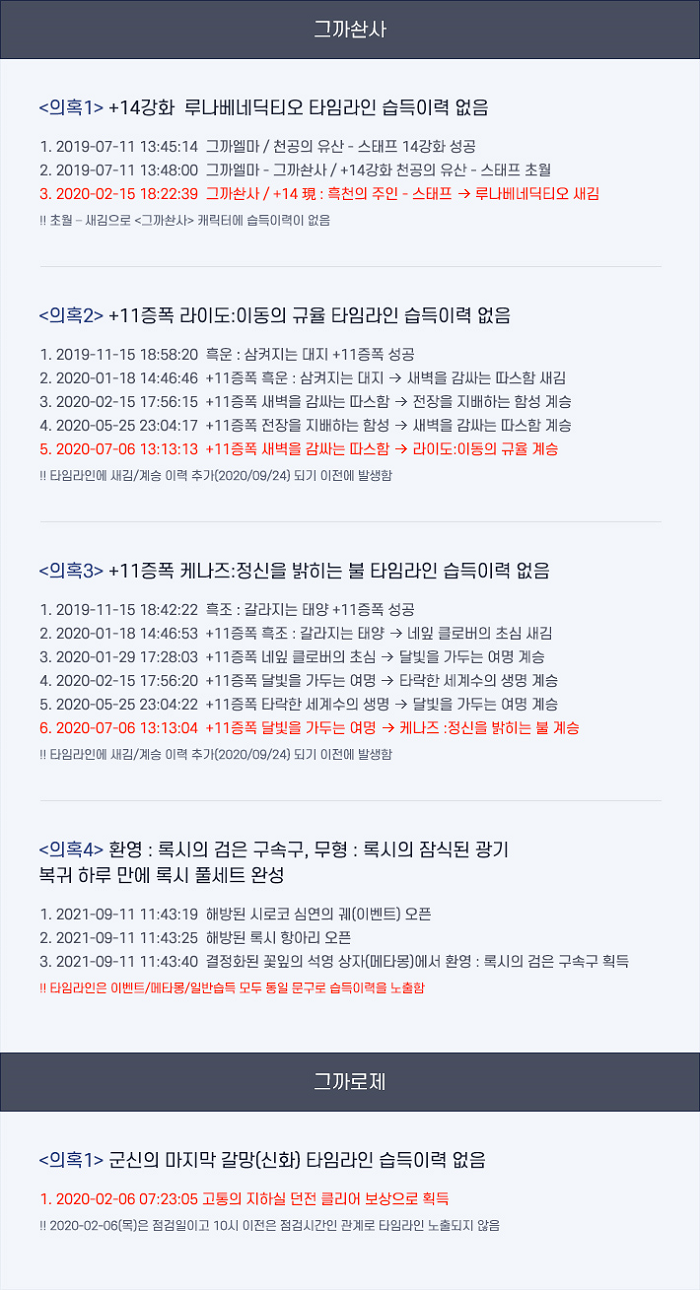 먼저 고강화 및 증폭 아이템은 모두 타임라인에 새김/계승 이력이 추가되기 이전에 해당 시스템을 이용했으며 19년도에 성공했던 아이템의 강화/증폭 수치를 이전한 것이라고 전했다. 군신의 마지막 갈망은 2020년 논란 발생 전 점검 시간에 개인 계정으로 접속해 정상적인 게임플레이로 얻은 것이며 현재는 내부 직원이어도 해당 방식으로 접속하지 못하게 변경했음을 밝혔다.