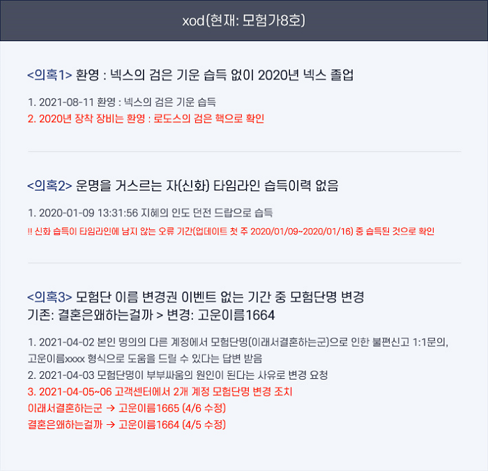 추가로 같은 의혹을 받던 계정 중 모험단명 변경을 한 'xod' 캐릭터(모험단 : 모험가8호)에 대해선 기존 모험단명 '결혼은왜하는걸까'가 부부 싸움의 원인이 된다는 사유로 변경 요청을 받았으며 이에 '고운이름1664'로 바꿨다고 전했다. 이어 조사 과정 중 차단한 캐릭터의 모험단 명이 변경 전으로 보이는 버그를 발견했다며 21년 중 수정할 계획이라 말했다.