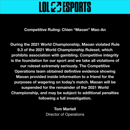 일련의 사건에 대해 라이엇 게임즈의 '톰 마텔' 운영 디렉터는 '2021 월드 챔피언십 동안 마오안이 도박과 관련된 규정을 위반하는 확실한 증거를 입수했다. 마오안은 도박을 목적으로 외부인에게 정보를 유출했으며, 이에 월드 챔피언십의 남은 기간 동안 경기에 출전할 자격을 박탈한다"라고 전했다.