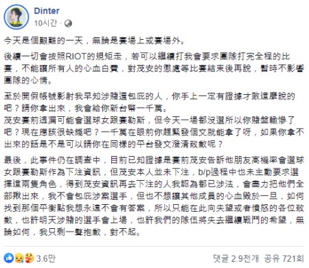 라이엇 게임즈의 입장문 = 리그 오브 레전드 e스포츠 공식 SNS