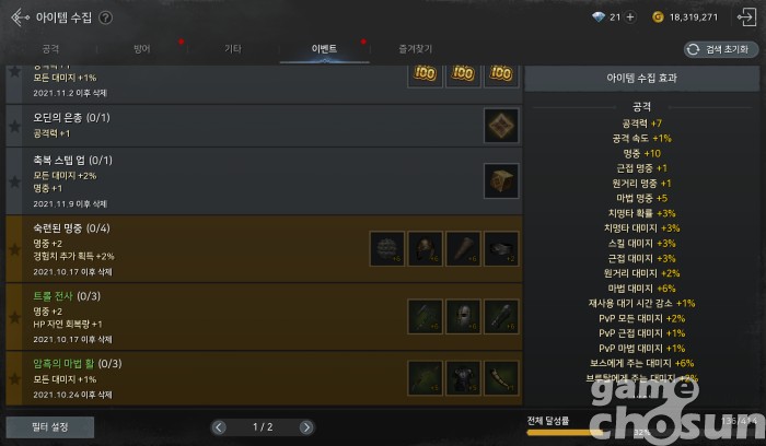아이템 수집의 이벤트 탭도 주목해야할 부분 중 하나다. 아이템 수집 이벤트 탭에서는 일정 기간 동안만 특정 능력치를 제공받는 목표가 존재하는데, 비록 영구적인 능력치를 얻지는 못하지만 특정 기간동안 매우 높은 수준의 능력치를 제공받으므로 아이템 수집 이벤트가 갱신되면 가장 먼저 완성해야할 목표다.