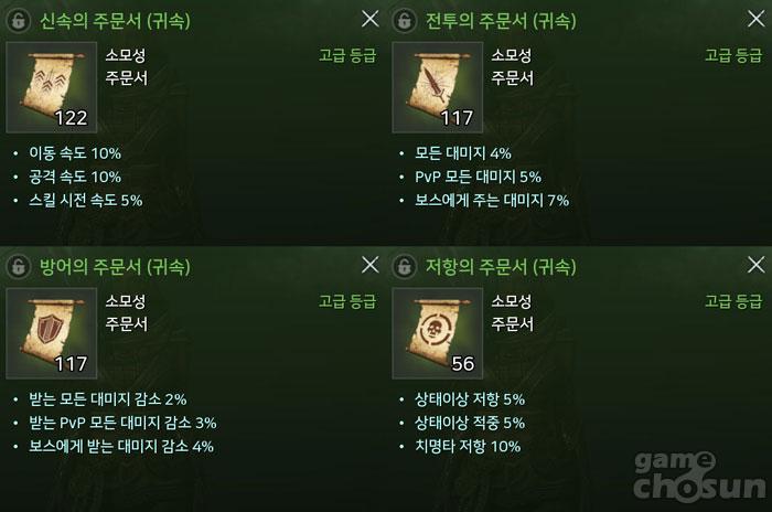 봉인의 정수와 더불어 주문서 4종의 적극 활용도 공략 포인트 중 하나다. 주문서 4종은 '신속의 주문서', '전투의 주문서', '방어의 주문서', '저항의 주문서'로 나뉘는데, 이를 활용하면 10분 동안 이동 및 공격, 스킬 시전 속도, 대미지 상승, 받는 대미지 감소, 그리고 상태이상 저항 및 적중, 치명타 저항이 상승해 일시적으로 캐릭터의 능력치를 끌어올릴 수 있다.