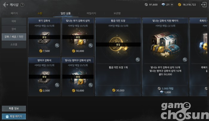 무기 및 방어구 강화석, 그리고 빛나는 무기 및 방어구 강화석 상자에서 일정 확률로 등장하는 이발디 강화석은 여타 콘텐츠 및 이벤트를 통해서도 획득할 수 있는 아이템이기는 하나, 언제나 강화석은 모자라기 마련이다. 특히 공허의 유적에서 획득하는 이발디를 포함한 무기 및 방어구 강화석은 거래소 판매를 통해서 최대한 다이아를 확보하는 쪽으로 활용하는 것이 좋으므로 골드 판매 상품으로 물량을 얻는 것이 좋다.