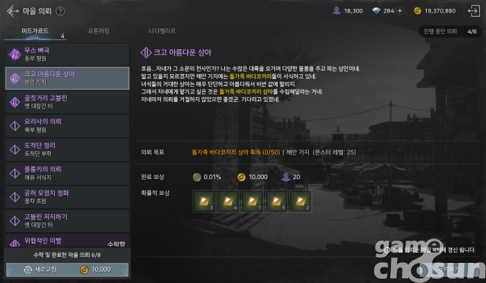 물론 앞서 언급한 바와 같이 높은 등급을 택할수록 희귀 등급 장비를 얻을 수 있는 등 보상의 질이 높아지기는 하나, 희귀 등급 장비를 획득할 가능성이 높지 않으므로 확률이 조금 더 높은 아이템 제작 재료를 높이는 것이 현명하다. 또한 마을 의뢰 플레이 시간을 아끼고 싶다면 자신이 현재 메인 퀘스트를 진행하고 있는 지역의 의뢰를 진행하는 것보다 이전 지역의 의뢰를 수행하는 것이 좋다.