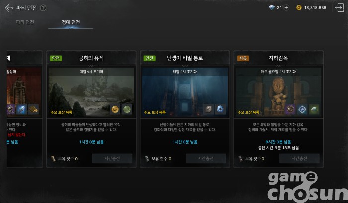 정예 던전 '공허의 유적'과 '난쟁이 비밀 통로'를 매일 이용하는 것도 매일 필히 플레이해야하는 핵심 콘텐츠 중 하나다. 공허의 유적에서는 많은 양의 골드와 경험치를 획득할 수 있으므로 캐릭터 성장에 매우 중요하며, 난쟁이 비밀 통로에서는 장비 강화석과 세공석을 획득 가능함에 따라 장비 성장에 큰 영향을 끼친다.