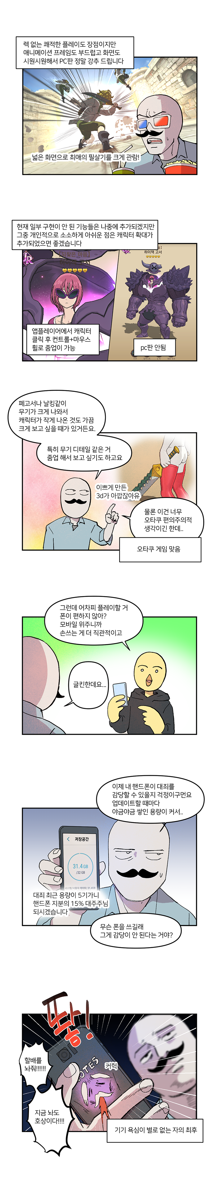 국도작가는 PC 버전을 직접 체험한 후 PC에서만 느낄 수 있는 대화면과 안정된 프레임 수를 장점으로 꼽았다. 캐릭터 확대 등 소소한 기능이 사라진 것이 아쉽지만, 충분한 몰입감을 선사한다며 만족감을 나타낸 것. 특히 구형 휴대폰을 가지고 있는 게이머에겐 큰 도움이 될 것이라고도 덧붙였다.