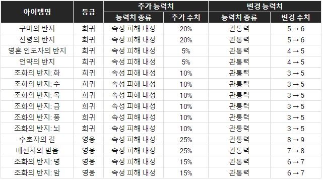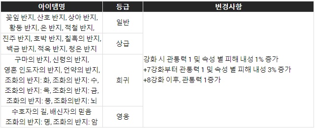 반지의 강화 효율 또한 개선이 이뤄졌는데, 강화 시 관통력과 속성별 피해 내성이 증가한다. 노리개는 기븐 농력치를 추가하는 한편 강화 효율을 개선해 캐릭터의 성능이 증가하도록 했다.