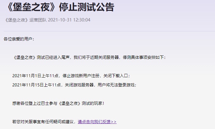 텐센트는 지난 2018년부터 에픽게임즈의 빌딩 액션 TPS 포트나이트 중국 버전을 서비스해왔으나, 지난 10월 31일 공식 홈페이지를 통해 게임 서버 종료 일정을 공지했다. 공지사항에 따르면 11월 1일을 기점으로 게임에 대한 신규 가입과 다운로드가 불가능해지며, 11월 15일에는 최종적으로 게임 서비스가 종료된다.