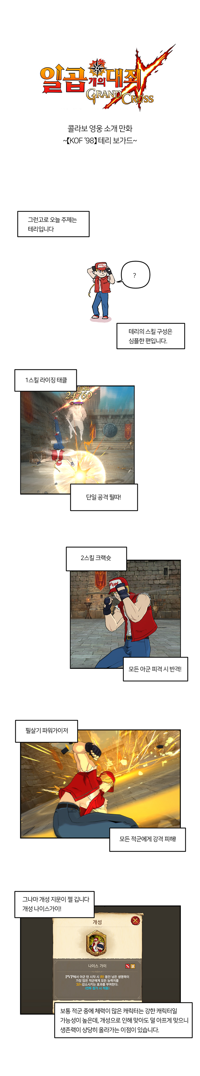 테리의 최대 특징은 '크랙 슛' 스킬. 아군중 아무나 공격당하면 반격을 가하는 스킬로 기존에도 동일한 스킬을 가진 영웅은 있었지만, 대미지가 너무 낮아 효용성이 없었던 것에 비해 테리는 개성과 스킬 특성을 활용해 상당히 높은 대미지를 기대할 수 있다. 그 외에도 필살기 견제, 적 최고 체력 영웅의 스탯 감소 등의 특성을 가지고 있어 어떤 조합에도 어울리는 영웅으로 평가받는다.