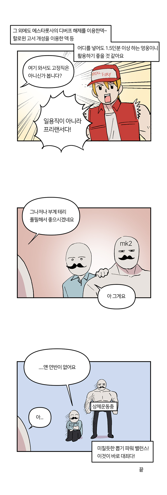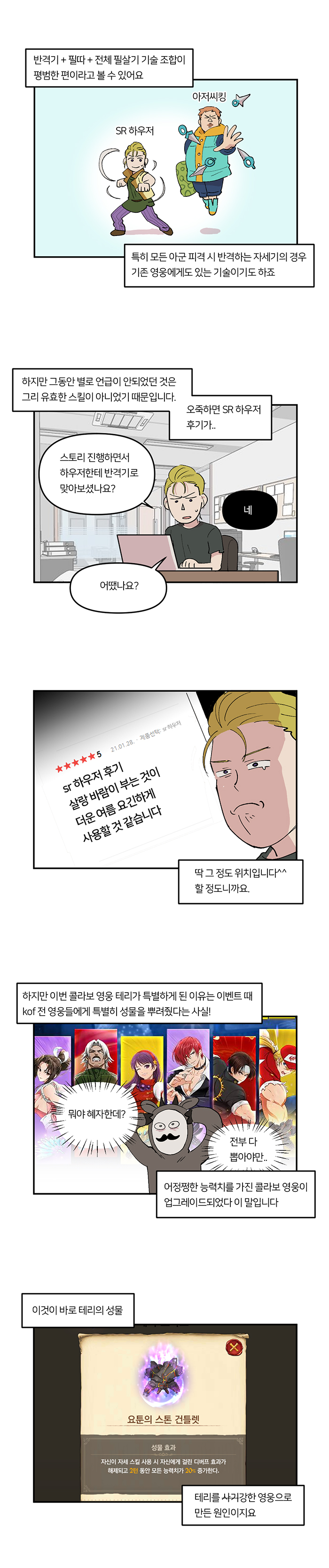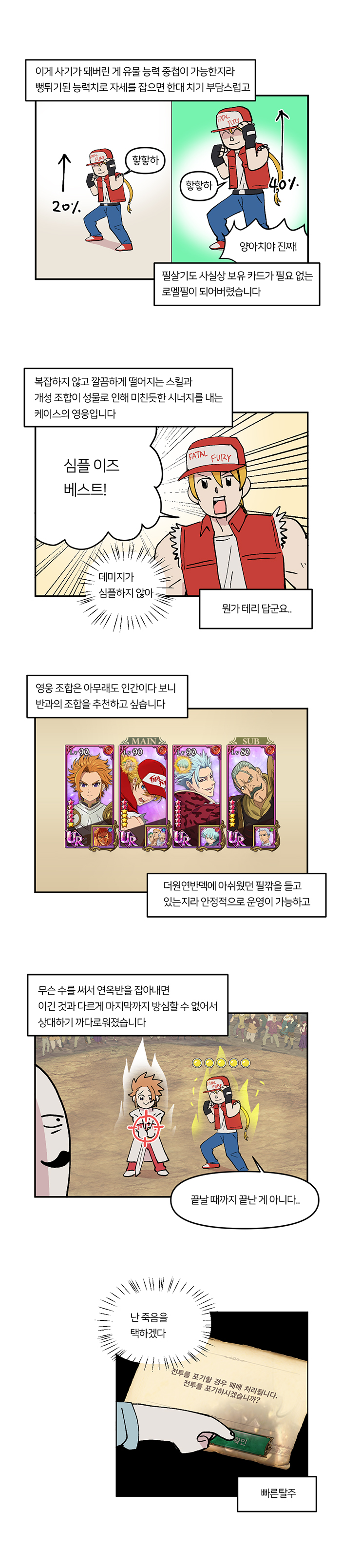 '무지성 반격'편은 '더킹오브파이터즈 98(이하 KOF98)' 복각 컬레버레이션에서 신규 등장한 테리와 이오리 두 영웅 중 테리를 보다 높은 비중으로 다룬다. 테리는 두 영웅 중 페스티벌 영웅에 버금가는 성능을 가진 것으로 알려져 높은 인기를 구사하고 있는 중이기도 하다.