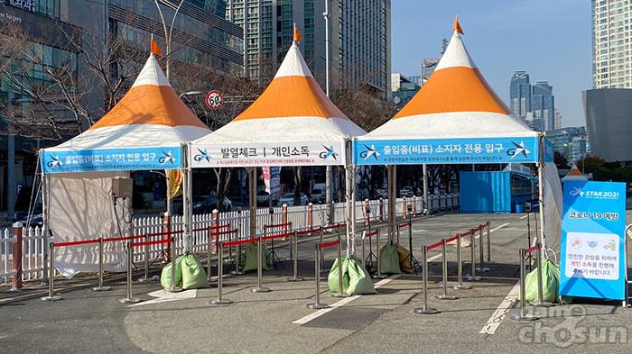 행사가 진행되는 벡스코는 오프라인으로 치뤄졌던 이전의 지스타와는 다른 모습으로 준비돼 있었다. 야외 부스가 운영되던 벡스코 야외 주차장은 코로나19의 예방과 수많은 참관객의 안전을 위해 발열 체크 및 개인 소독을 위한 공간으로 활용되는 모습이다.