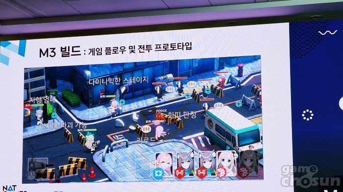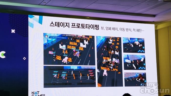 이어 블루 아카이브의 기안서를 작성했던 과정을 소개했다. 컬렉션 게임에서 수집한 캐릭터를 최대한 보여줄 수 있는 분대형 전투와 근거리 전투보단 원거리 전투를 지향해 구성했다고 전했다. 근거리 전투 비중이 높아질 경우 액션 게임에 가까워줘 캐릭터당 제작 코스트가 높아지기에 양산에 불리하고. 캐릭터가 적으면 컬렉션 게임이 성립할 수 없기에 원거리 전투 게임으로 방향을 정했다고 덧붙였다.