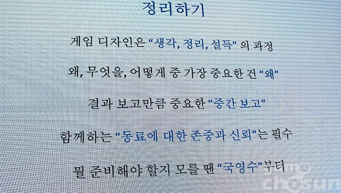 마지막으로 게임 디자이너를 준비하는 것에 대해 '국영수'로 설명했다. 먼저 '국어'는 타인과 의사소통은 불가피하며, 게임 디자이너는 설득하는 것이 기본 업무다. '영어'는 영어권 개발자들의 개발 문화 지식을 접할 시회가 늘어나며, 테이터 테이블의 컬럼 이름이나 엔진 어셋의 변수 이름 정할 때 중요하기 때문이다. '수학'은 밸런스 조절, 효율적인 문제 해결, 수학으로 단련할 수 있는 논리력이 업무에 큰 영향을 준다고 강조했다.
