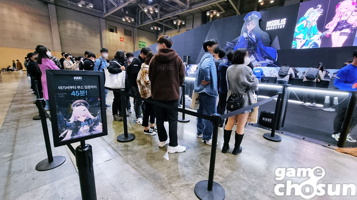 특히 주말 첫 날인 20일 오후에는 니케를 플레이해보기 위해 놀이공원을 연상케하는 이 지점에선 45분이 예상된다는 안내문을 볼 수 있을 정도로 많은 사람들이 찾아오고 있다.