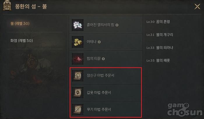 불 속성 몽환의 섬도 고유한 특징을 가지고 있다. 바로 드랍 아이템이다. 여타 3개 속성 던전에서는 각 속성 부여석을 비롯해 흩어진 엘릭서의 힘, 마물의 정수, 그리고 몬스터 도감 등록 아이템 등을 동일하게 획득 가능한데, 몽환의 섬 - 불에서는 장신구 마법 주문서, 갑옷 마법 주문서, 무기 마법 주문서 등이 드랍된다. 따라서 가장 인기가 많은 속성 던전으로 자리매김하고 있다.