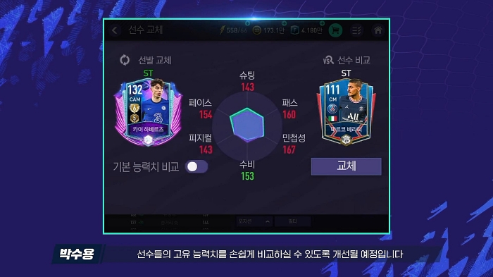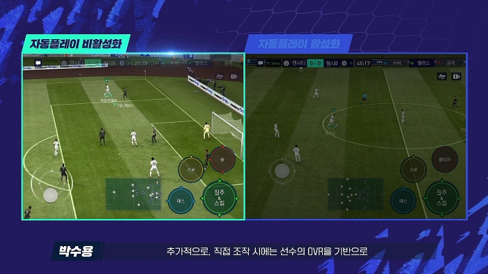 직접 플레이할 때는 능력치를 기반으로 선수들의 AI를 적용하고, 자동플레이 경우에는 AI가 약간 주춤하게 하향 조정해 직접 조작할 때 이점이 좀 더 늘어나도록 개선할 예정이다.