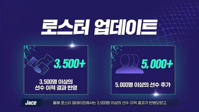 다음으론 21-22 시즌 로스터 업데이트가 진행된다. 황희찬, 이강인 등 3천5백 명 이상의 선수 이적을 반영해 5천 명 이상 선수 추가 및 4천 명 이상 선수 제외를 통해 실제 축구 리그와 가까운 환경을 제공한다.