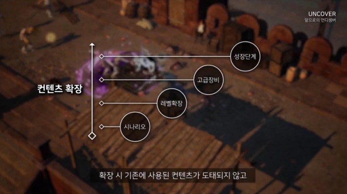 콘텐츠 확장의 경우에는 종적 확장이 이뤄진다. 신규 시나리오, 상위 레벨과 장비, 그리고 성장 단계의 추가 및 확장이 핵심이다. 확장 시에는 기존에 사용된 콘텐츠가 도태되지 않고 자연스럽게 이어질 수 있는 연결고리를 충분히 고려해서 적용한다. 특히 기존 도전을 더욱 어렵게 만들 다양한 도전 요소와 더불어 그에 걸맞는 다양한 성장 요소를 준비중이다.