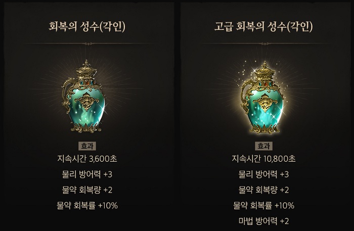 회복의 성수와 고급 회복의 성수는 위와 같이 영웅 무기 제작 재료로도 사용되지만 버프 아이템으로 활용할 수도 있다. 회복의 성수를 사용하면 물리 방어력 +3, 물약 회복량 +2, 물약 회복률 +100%의 효과를 1시간 동안 얻을 수 있으며, 고급 회복의 성수는 회복의 성수 기본 효과에 마법 방어력 +2가 더해져 3시간 동안 적용받는 것이 가능하다.