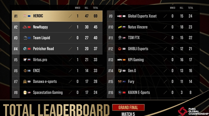 1일차의 마지막 5경기는 매 경기마다 꾸준히 킬을 달성하면서 종합 순위 상위권을 달리고 있는 히로익의 진가를 확인할 수 있었다. 히로익은 5경기의 위너가 되었을 뿐만 아니라 압도적인 포인트를 획득하면서 종합 순위 1위를 차지했다. 이로써 히로익은 2위 뉴해피와 무려 24점 차를 기록했다. 또한 5경기에서는 이전 2경기에서도 눈부신 활약을 보여줬던 다나와의 살루트 선수가 역투하면서 눈길을 끌었다.