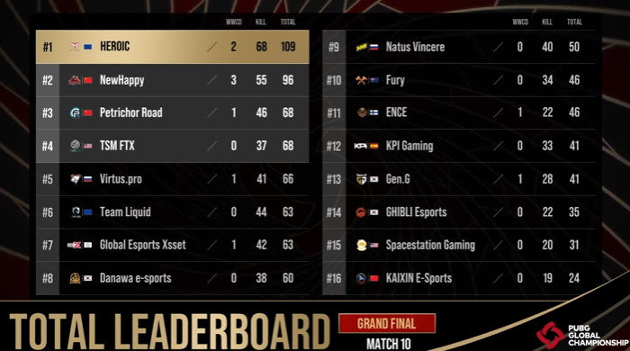 2일차 마지막 10경기, 히로익은 2위와 점차 점수를 벌려갔으며, 우승을 향한 굳히기에 돌입했다. 10경기에서는 KPI와 FURY가 부진을 극복하고 맹활약하면서 주요 팀을 잡아내는 모습을 보였으며 다나와 e스포츠 또한 효율적인 교전을 통해 킬 포인트를 따내면서 점차 순위를 상승시켜갔다. 뉴해피는 히로익을, 그리고 다나와 e스포츠는 TSM을 잡아냈으며 뉴해피와 다나와 e스포츠의 마지막 교전에서는 뉴해피가 승리하면서 다나와 e스포츠는 아쉽게 치킨을 놓치게 됐다.