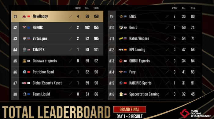 PGC 2021의 최종 우승팀은 그랜드 파이널 마지막 경기를 통해 가리게 됐다. 뉴해피와 히로익은 초반부터 서로를 견제하는 모습을 보였으며, 초반 교전에서는 히로익이 우위를 점했다. 이들의 교전에 버투스 프로가 개입하면서 뉴해피는 조기탈락 위기에 빠졌다. 결국 뉴해피는 히로익에 이은 버투스 프로와 나투스 빈체레의 이어진 협공에 조기탈락하면서 히로익에게 최종 우승이 넘어가는 듯 했다.