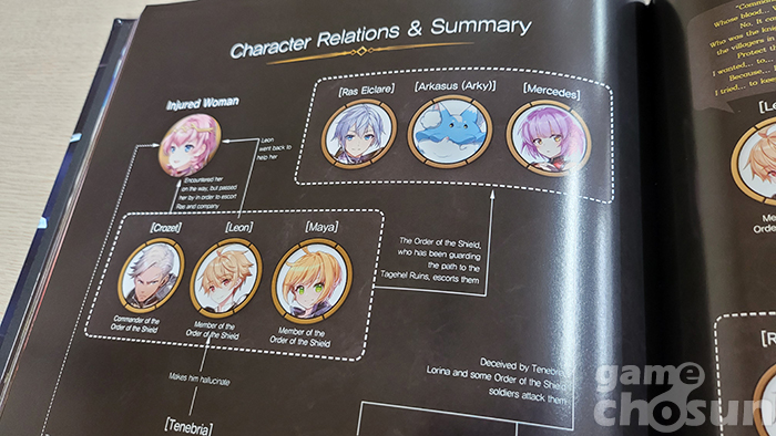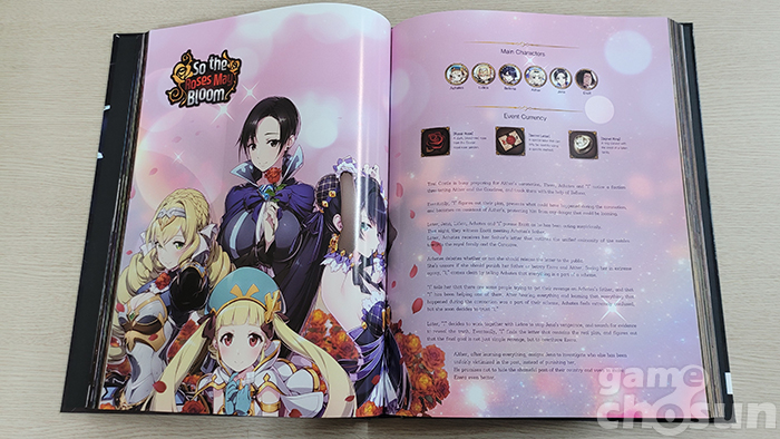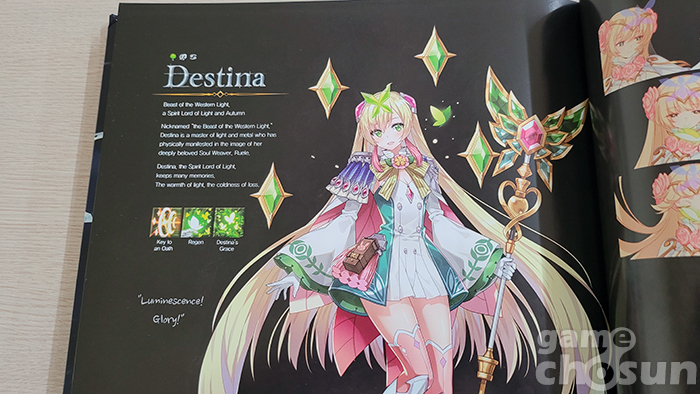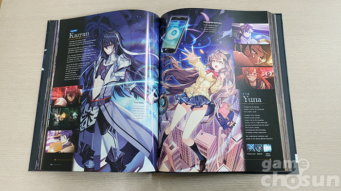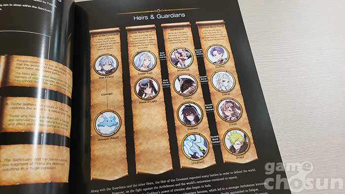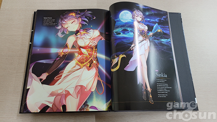 우선 기존 게임 아트북이 콘셉트별로 나눠진 '디자인 그래픽 모음집'이었다면 에픽세븐 아트북은 인게임 스토리에 맞춰 구성된 '읽는 재미'가 있는 아트북이라는 점이다. 제작진 인터뷰와 에픽세븐 에피소드1의 전체 스토리를 요약하고, 이후 챕터 1부터 챕터 10, 에필로그까지 순차적으로 포함돼 단순히 '보는' 아트북에서 탈피해 스토리를 되짚어 볼 수 있는 백과사전 느낌이 강한 편이다.