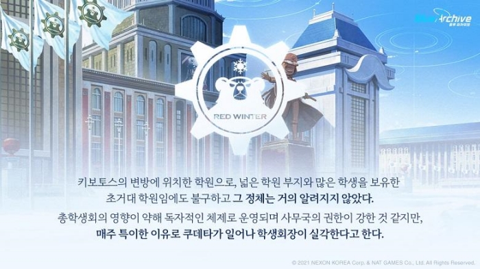 이번에 업데이트된 신규 캐릭터는 기존에 있는 학원이 아닌 '붉은겨울 연방학원'에 소속되어 있다. 블루 아카이브 정식 서비스 이후 최초로 새로운 학원이 등장했으며 이벤트 역시 이곳이 주 무대가 되어 학생회장 체리노와 서기관 노도카를 둘러싼 이야기가 펼쳐진다.