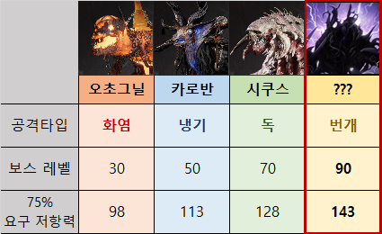 개발자의 편지에서 이미 선보인 3가지 레이드 대비 난이도가 높고 많은 컨트롤을 요구하게 될 것이라 선언한 만큼 생존을 도모하기 위해선 적정 원소 저항력을 맞추는 것이 필수다. 보스의 레벨이 높기 때문에 요구 저항력도 꽤 높을 예정이다.