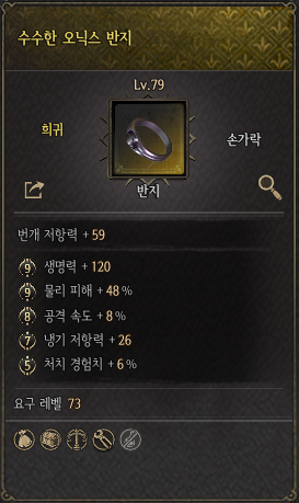 보스 레벨이 90이므로 143의 번개 저항력을 맞춰야 최대 수치인 75%에 도달하게 된다. 카오스 던전 파밍 중 73레벨 '수수한 오닉스 반지'를 얻었다면 적당히 인챈트를 거쳐 90레벨 레이드용으로 구비해두는 것이 좋다.